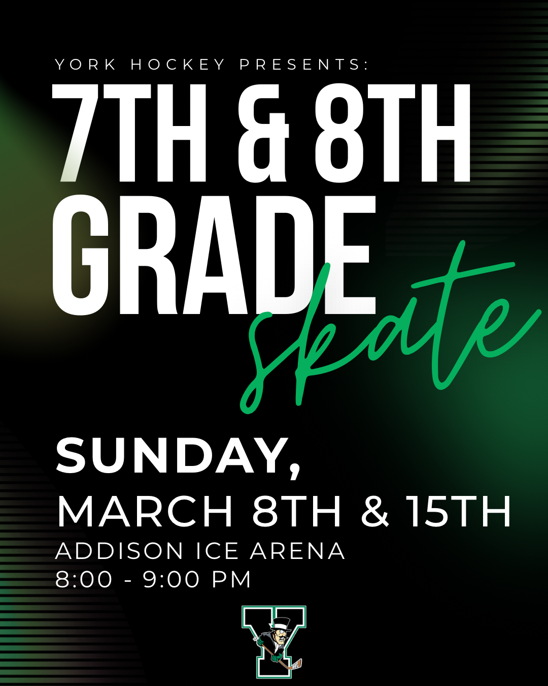 Calling all 7th & 8th-grade Elmhurst boy hockey players, join the Dukes for a skate on Sunday, March 8th & 15th from 8:00-9:00 PM at Addison Ice Arena. Come out for a chance to meet the coaches, other potential players, and learn about York Hockey. See you there!